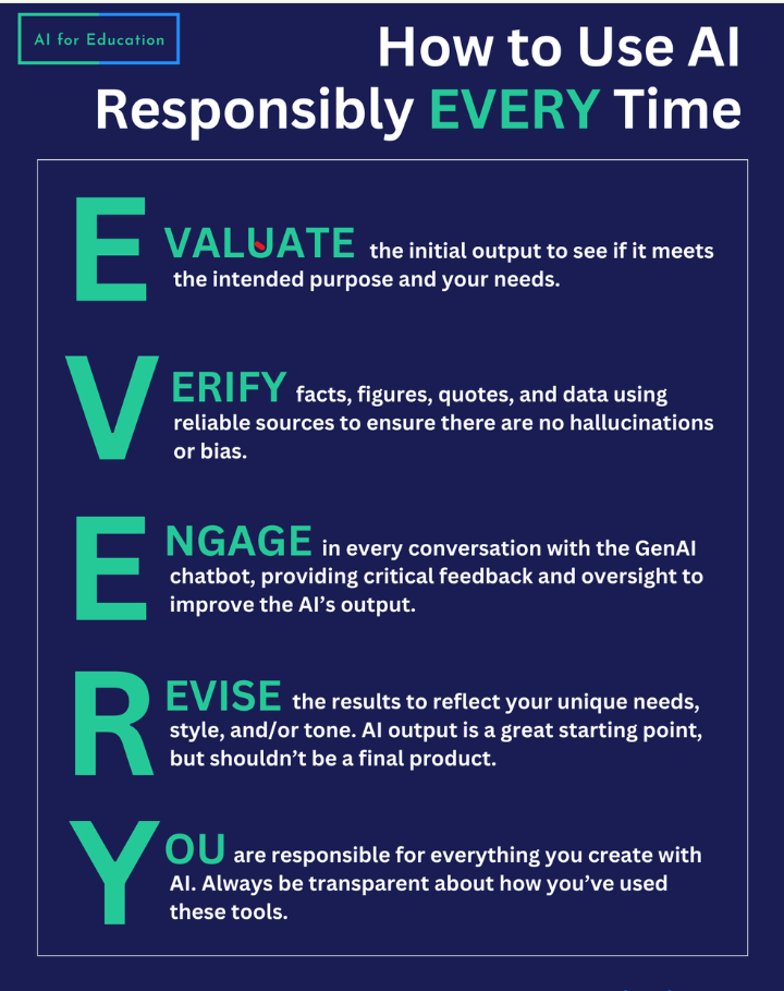 how to use AI responsibly.https://www.aiforeducation.io/ai-resources/how-to-use-ai-responsibly-every-time#:~:text=You%20are%20ultimately%20responsible%20for%20everything%20you,ensure%20there%20are%20no%20hallucinations%20or%20bias